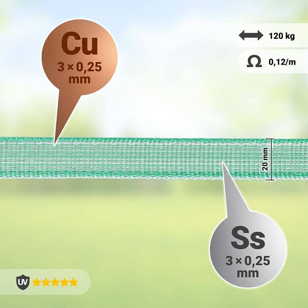 Kompletní sada elektrické ohrady obsahuje ohradníkovou pásku s šířkou 20 mm v návinu 200 m. Tři měděné vodiče zajistí maximální vodivost - odpor pouze 0,10 Ω/m. Zatímco tři nerezové vodiče se postarají o pevnost vodiče. Výšku ohrazení až 136 cm nad zemí vytvoříte pomocí mobilních plastových sloupků s 11 očky pro individuální volbu tažení vodičů. Nechybí ani zemnící tyč. Kompletní sada elektrického ohradníku je praktická a snadno se sestavuje.