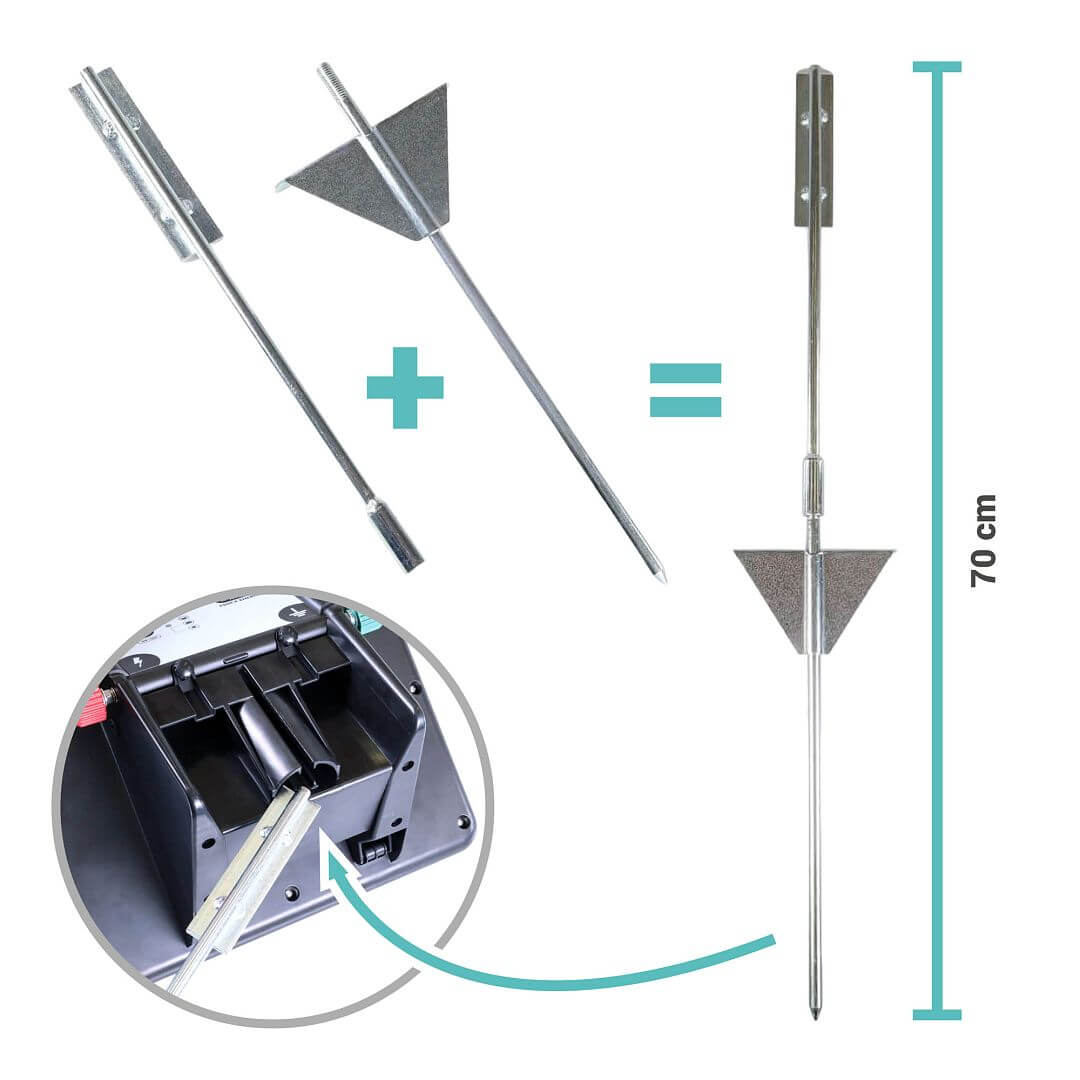 Montážní držák na zadní straně zařízení umožňuje upevnění ohradníku na speciální montážní a zároveň zemnící tyč (obsah balení) na jakémkoliv místě. Pro správnou orientaci solárního panelu ke slunci využijte možnosti otáčení v rozsahu 360º. Zařízení lze nasunout také na ohradníkový T-sloupek nebo univerzální U-slupek.