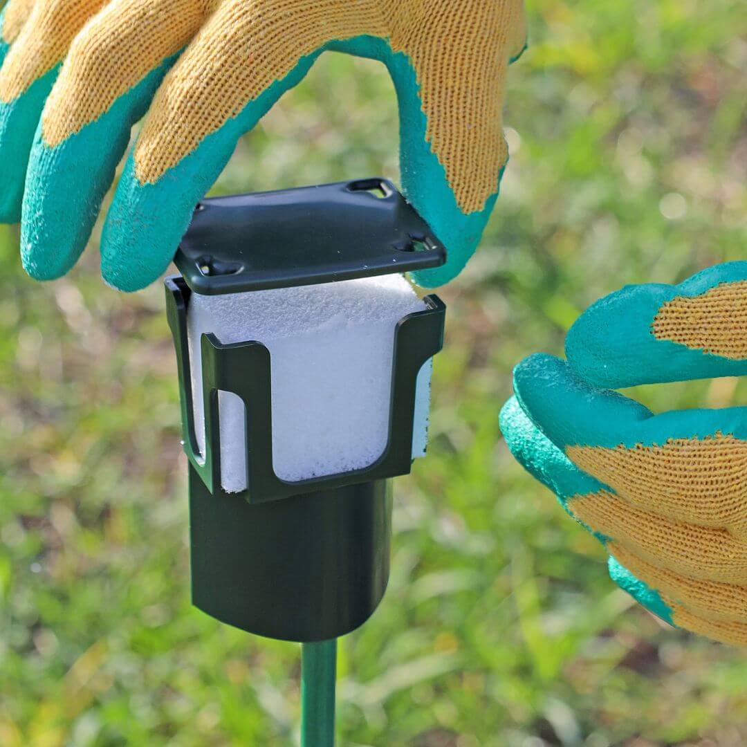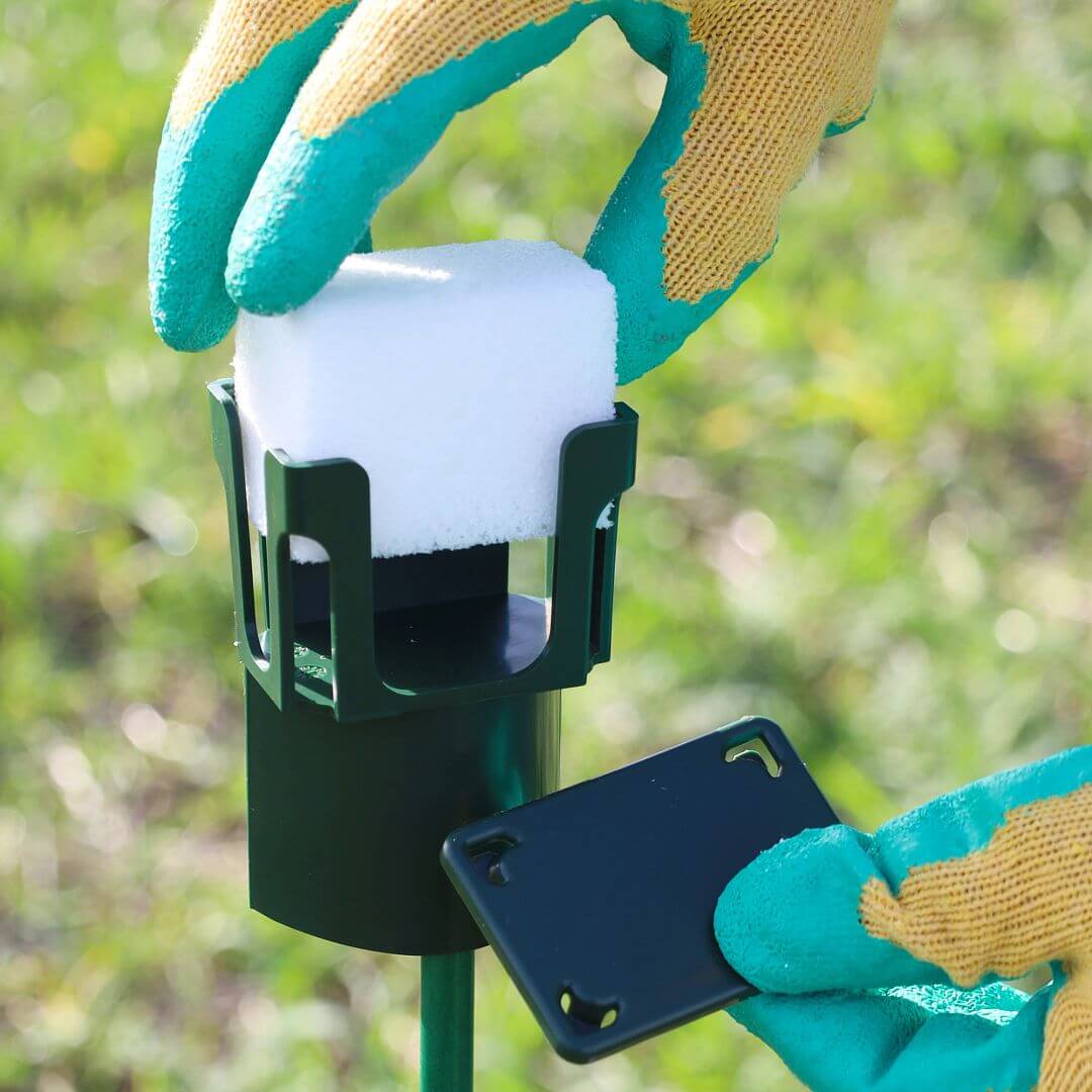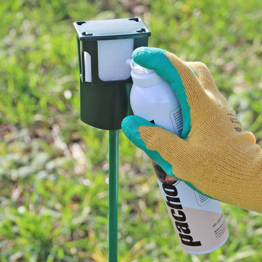 Pachový ohradník proti vysoké zvěři, divočákům i zajícům obsahuje pachovou látku, která imituje pach predátora a pomáhá držet zvěř daleko od rušných komunikací. Nejprve vložte biodegradabilní nosič pachového ohradníku BIO10-PO do speciálního PROFI adaptéru. Adaptéry s nosiči umístěte na sklolaminátové sloupky a rozmístěte je v rozestupu 10 metrů od sebe. Injektujte ekologické nosiče pachové látky koncentrátem pachového ohradníku po dobu 1 sekundy na 3 místech.