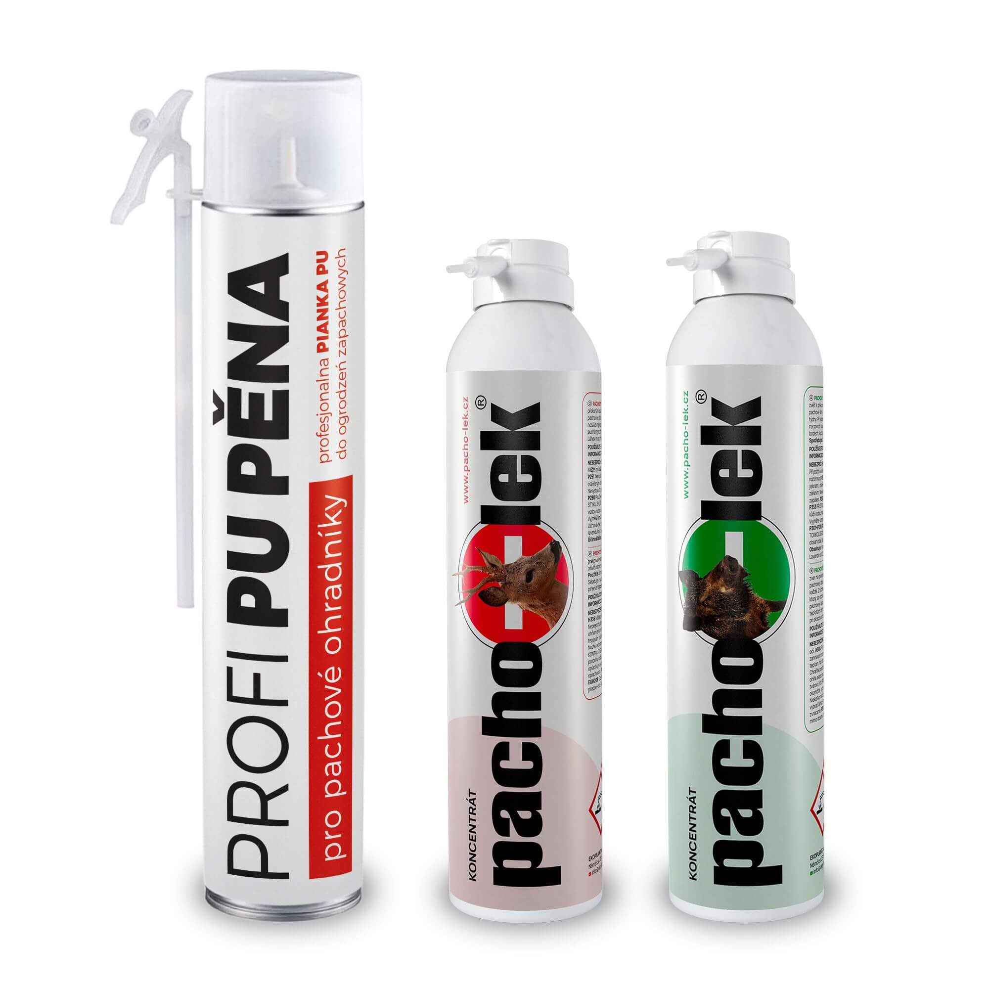 Sada zahrnuje 1 ks PU pěny o objemu 750 ml, 1 ks koncentrátu pachového ohradníku proti srnkám o objemu 250 ml a 1 ks koncentrátu pachového ohradníku proti černé zvěři o objemu 250 ml.