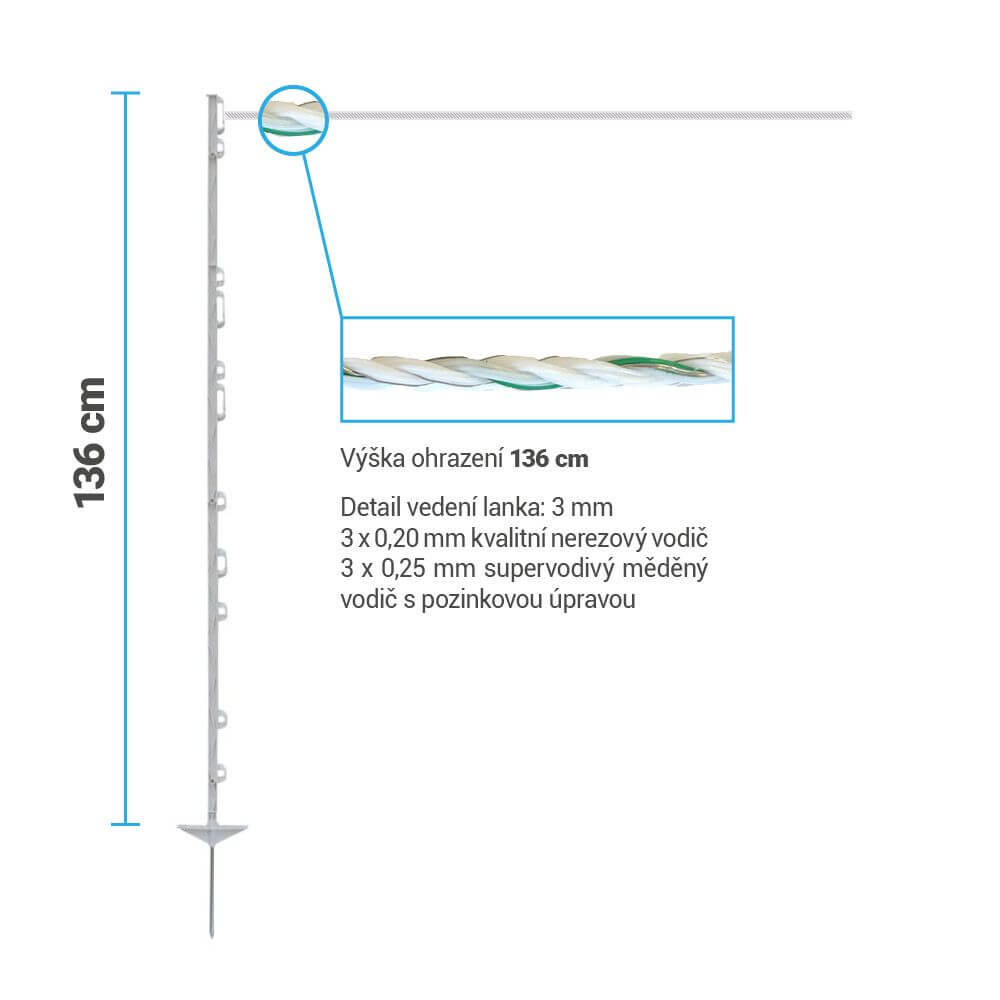 Obsahem sady je velmi kvalitní lanko s průměrem 3 mm a třemi měděnými vodiči, zajistí maximální vodivost i při dlouhých instalacích. Lanko k ohradníku v návinu 400 metrů je vyrobeno z pevného materiálu, který je odolný proti roztržení a vyniká dlouhou životností. Výšku ohrazení až 136 cm vytvoříte pomocí pevných plastových sloupků s 11 očky pro individuální volbu tažení vodičů.